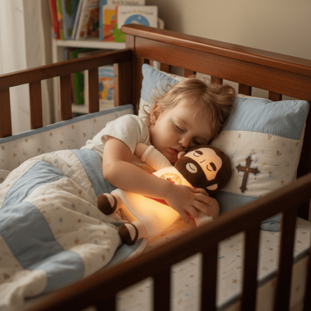 HolyHug™ features a soothing breathing motion that gently rises and falls, helping children feel calm, comforted, and at peace - a quiet reminder that Jesus is always with them.